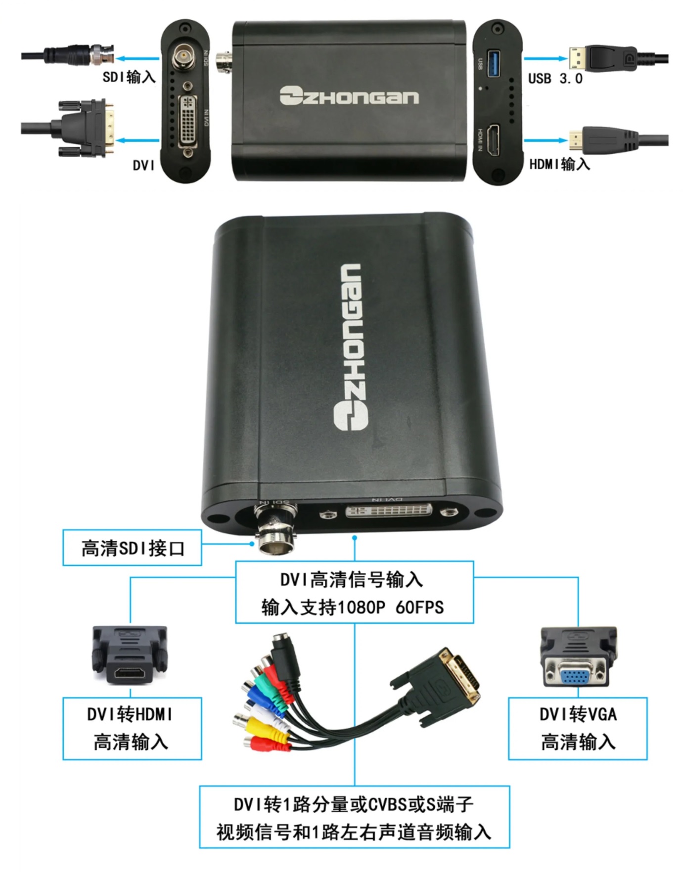 輸入接口 | 1個HDMI接口 1個DVI接口(可轉接VGA/CVBS/SVIDEO/YPBPR) 1個SDI輸入接口 模擬音頻立體聲輸入接口 |