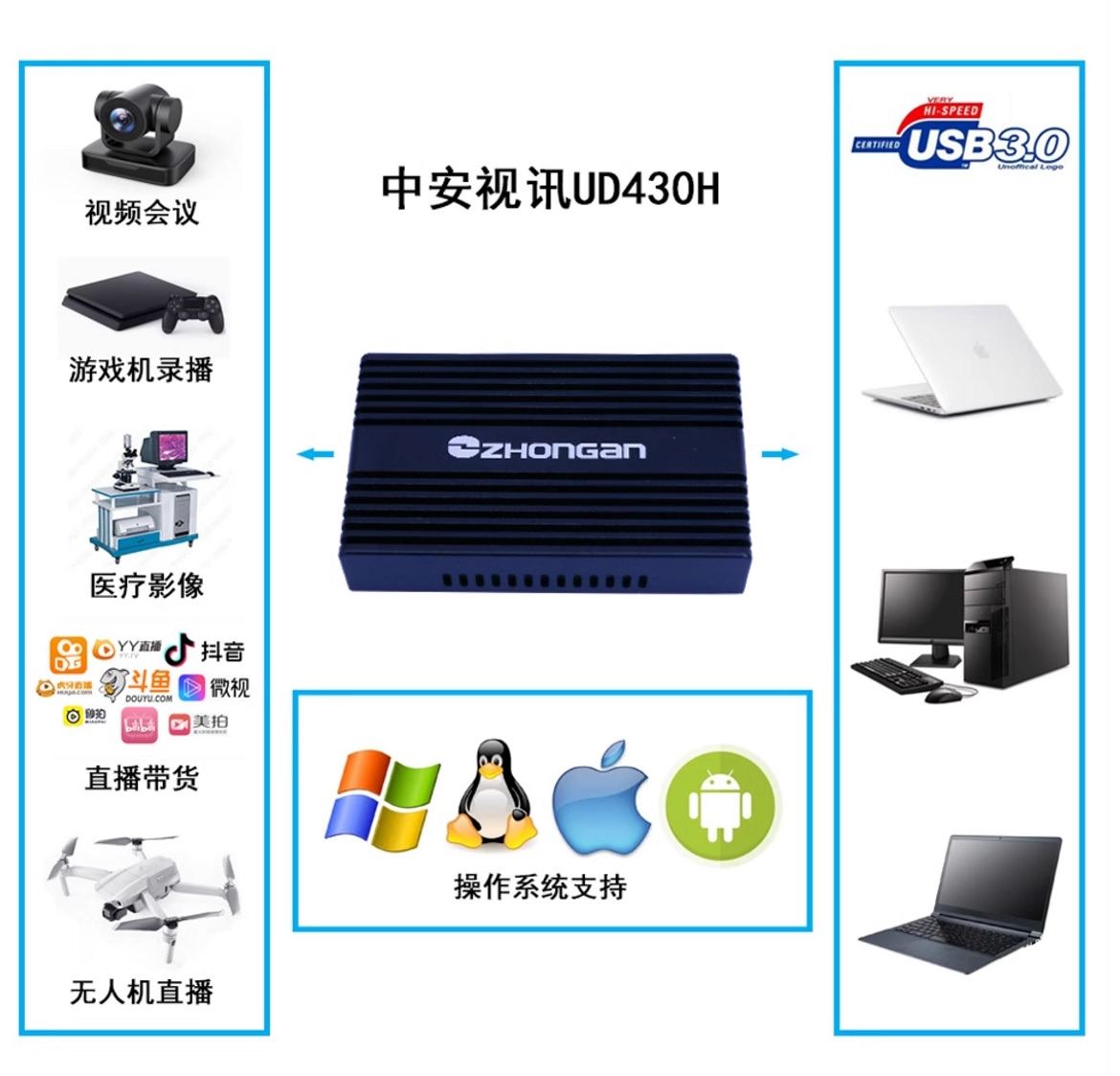 產品簡介 | UD430H一款4K 60HZ HDMI高清視頻采集盒,它采用了高速的TYPE-C接口,同時采用 UVC無驅設計,用戶可以做到即插即用無需安裝驅動。其最高分辨率可以實現4096×2160。 真正10Bit實時HD全分辨率高清無壓縮視頻采集,實現真正廣播級、 好萊塢電影級別的采集 編輯,滿足各種全高清攝像機實時監視采集及抓圖的需求。 我們提供完整的SDK開發包,可以選擇VisualBasic、VisualC++、Delphi,C#,Labview等多 種編程語言通過SDK進行開發。提供完整的Labview VI函數和測試demo程序,方便客戶快速 開發相關LABVIEW程序。我們還提供調用范例程序源程序及函數詳細調用說明,方客戶輕松 開發自己的應用系統;同時我們提供完善的開發技術支持,并可根據客戶要求量身定做SDK。 |